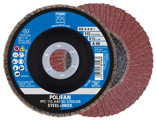 Pferd 62315. 5" x 5/8-11 Thd. POLIFAN® Flap Disc - A SG STEELOX, Aluminum oxide, 80 Grit, Conical. Comes 10 to a Pack, Please Order in Quantitites of 10