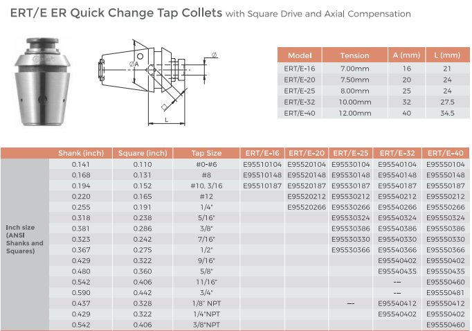 ER40 1/4NPT #12 Axial Compensating Quick Change Tap Collet. This ER40 Floating Tap Collet will Hold 1/4NPT ANSI Shank Taps. The Axial Float is great for Lathe Applications!