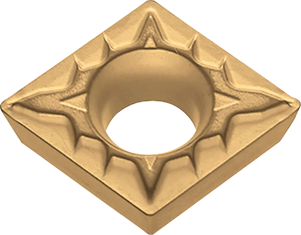 Kyocera CPMT 321XP CA5525 Grade CVD Carbide, 11 Degree, Diamond, Positive Rake Angle, Neutral Turning Insert for Light Interruption and Finishing in (P) Carbon/Alloy Steel. Positive Turning Inserts with .015 Radius. Inserts come 10 to a Pack, Please Order in Quantities of 10