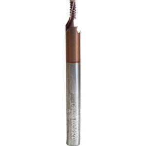 #Flutes:3, Cut Dia:0.13", Grade:MT9, IN-RH/LH, Matl:Carbide, Neck Len:0.35", Overall Len:2.5", Pitch:36.00 TPI, Shank Dia:(1/4)mm, Thread Dep:2.0xD1, Thread Form:UN, Thread Standard:8