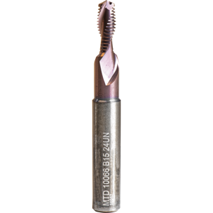#Flutes:3, Cut Dia:0.138", Grade:MT9, IN-RH/LH, Matl:Carbide, Neck Len:0.42", Overall Len:2.5", Pitch:24.00 TPI, Shank Dia:(1/4)mm, Thread Dep:2.0xD1, Thread Form:UN, Thread Standard:10,12