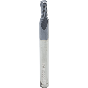 #Flutes:3, Cut Dia:0.13", Grade:MT9, IN-RH/LH, Matl:Carbide, Neck Len:0.35", Overall Len:2.5", Pitch:36.00 TPI, Shank Dia:(1/4)mm, Thread Dep:2.0xD1, Thread Form:UN, Thread Standard:8
