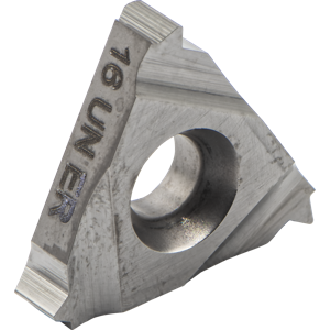 #Edges:3, #Teeth:1, CentrLn to Cut Edge:0.04"/0.9mm, Cut Edge to Matl:0.04"/1.1mm, EX-RH, Grade:P30, IC:(3/8)", Insert Size:16mm, Matl:Carbide, Pitch:16.00 TPI, Thread Form:UN, w/o Chipbreaker