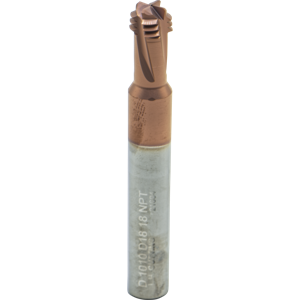 #Edges:1, #Flutes:4, Bottom Rel:0.055"/1.4mm, Chamf Dep:0.024"/0.6mm, Cut Dia:0.394", Grade:MT7, Has Cool:Bore, IN-RH/LH, Matl:Carbide, Neck Len:0.72"/18.2mm, Overall Len:2.9"/73mm, Pitch:18.00 TPI, Shank Dia:10.0mm, Thread Form:NPT, Thread Standard:(1/4)