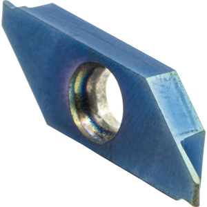 Grade:BLU, Style:Swiss Polygonal Lathe Insert (2 CutEdges / 1 Tooth), Machine:SWISS, Matl:CARBIDE, MaxCutDep:0.098", 2 CutEdges, OAL:0.9843", OAL:25.00mm, Rad(+/-.1"):00.0160", Metric