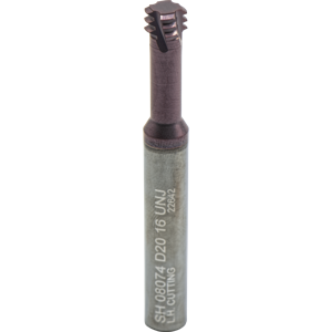 #Edges:1, #Flutes:4, Cut Dia:0.291"/7.4mm, Grade:MT6, IN-RH/LH, Matl:Carbide, Neck Len:0.81"/20.6mm, Overall Len:2.5"/64mm, Pitch:16.00 TPI, Shank Dia:8.0mm, Thread Dep:2.0xD1, Thread Form:UNJ, Thread Standard:(3/8)